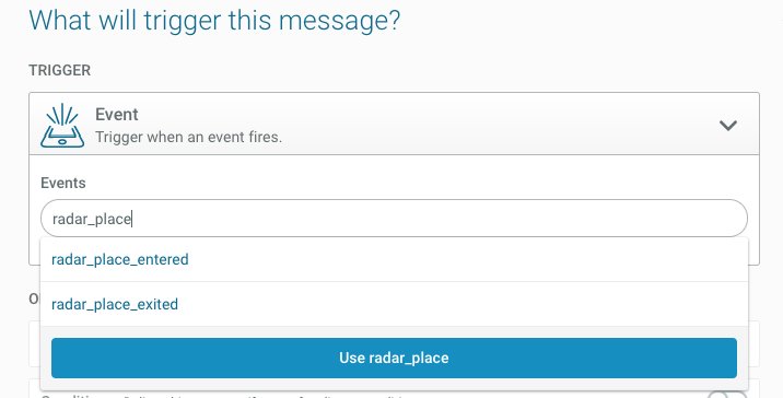 3) Select the Event trigger from the dropdown menu and search for the Radar event you wish to use. You’ll find two different events available for Places: one for an “Enter” event (radar_place_entered) and one for an “Exit” event (radar_place_exited). In our example, we’ll use an “Enter” event.