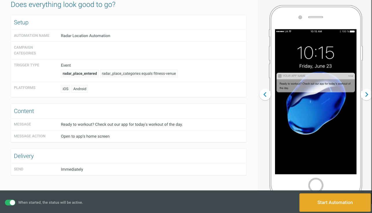 Triggering an automated message of a Places event makes it easy to send a notification when a user’s location matches pre-defined chain or category. For example, a restaurant brand could send a notification including a 20% off coupon to a user who enters one of its locations, or a retailer can share a special in-store exclusive via push notification. In our example, we’re setting up a notification as if we’re a fitness app that wants to send a notification to users who enter a location within the fitness/recreation category.