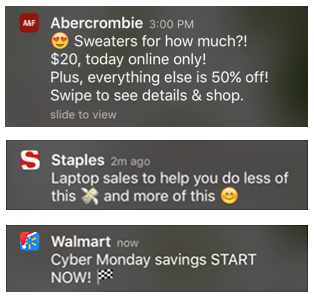 Examples of push notifications that included instructions, calls to action or emojis.