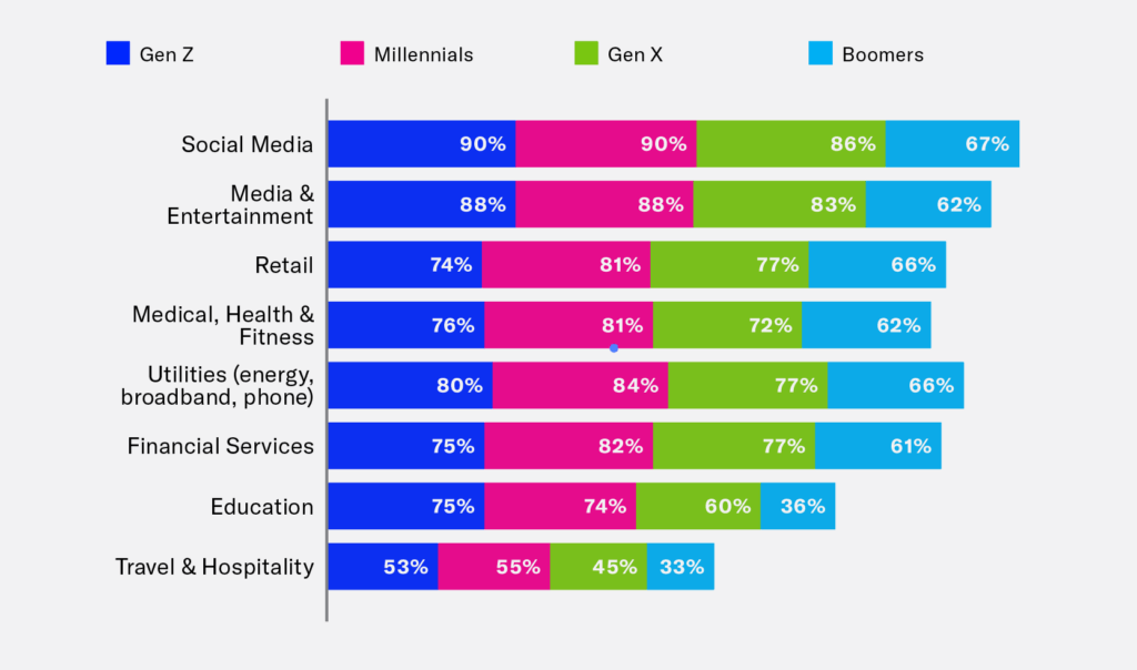 When we asked about the information people are willing to share with brands for personalized interactions and special incentives, we found that people are least likely to share “information from their social profiles” (35%). However nearly half will share their social values (environmental, moral, political, religious). This is especially relevant as other research has shown that ethics, corporate social responsibility and ESG (environmental, social and governance) factors are increasingly important to customers, and impact their purchasing decisions.