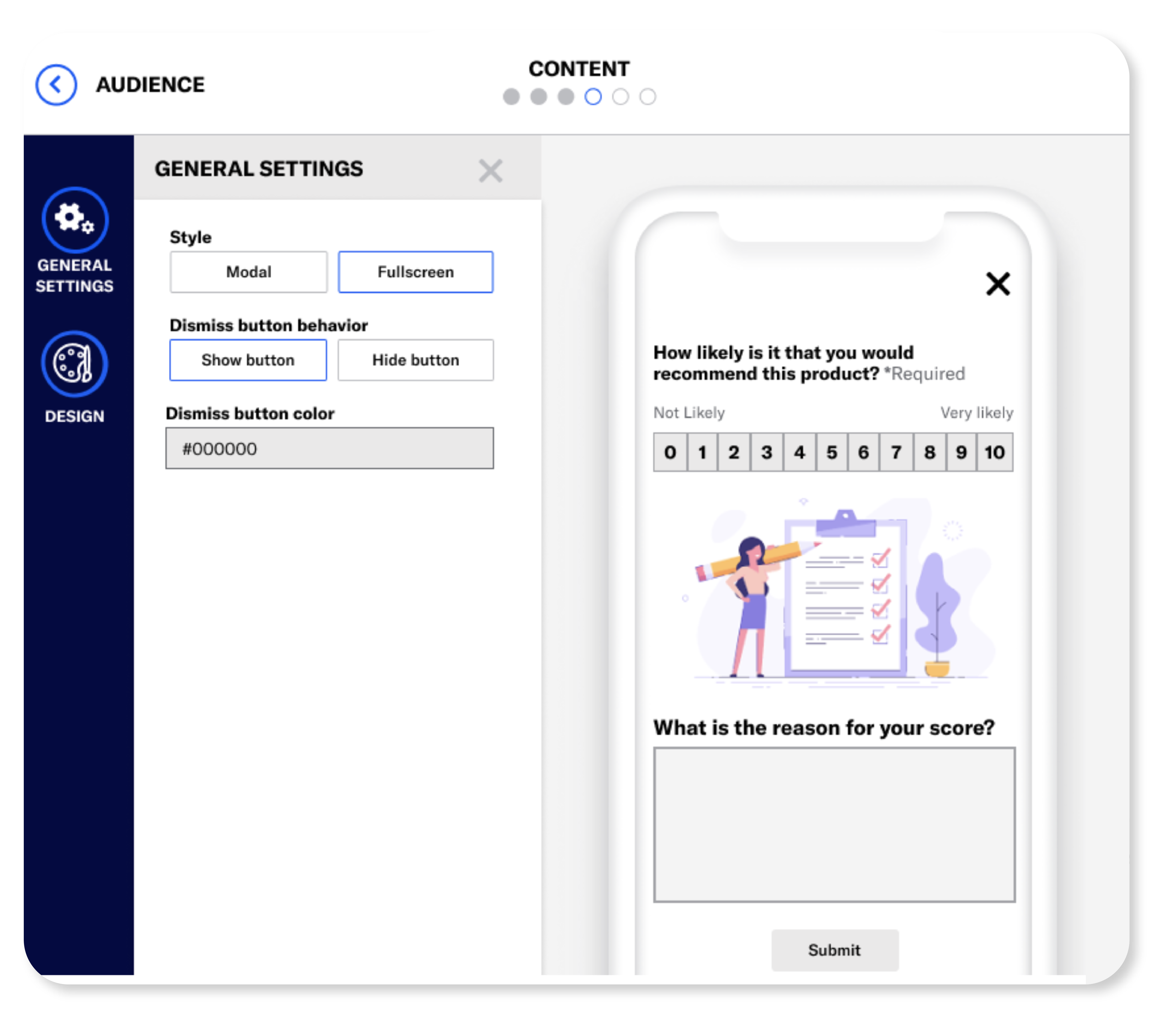 Use our pre-built NPS or customer feedback survey templates to launch surveys quickly and collect valuable data and insights directly from your customers. Serve up surveys at the right moment within any Scene to enhance customer interaction without interruption. Store survey responses as customer attributes for retargeting and analysis.