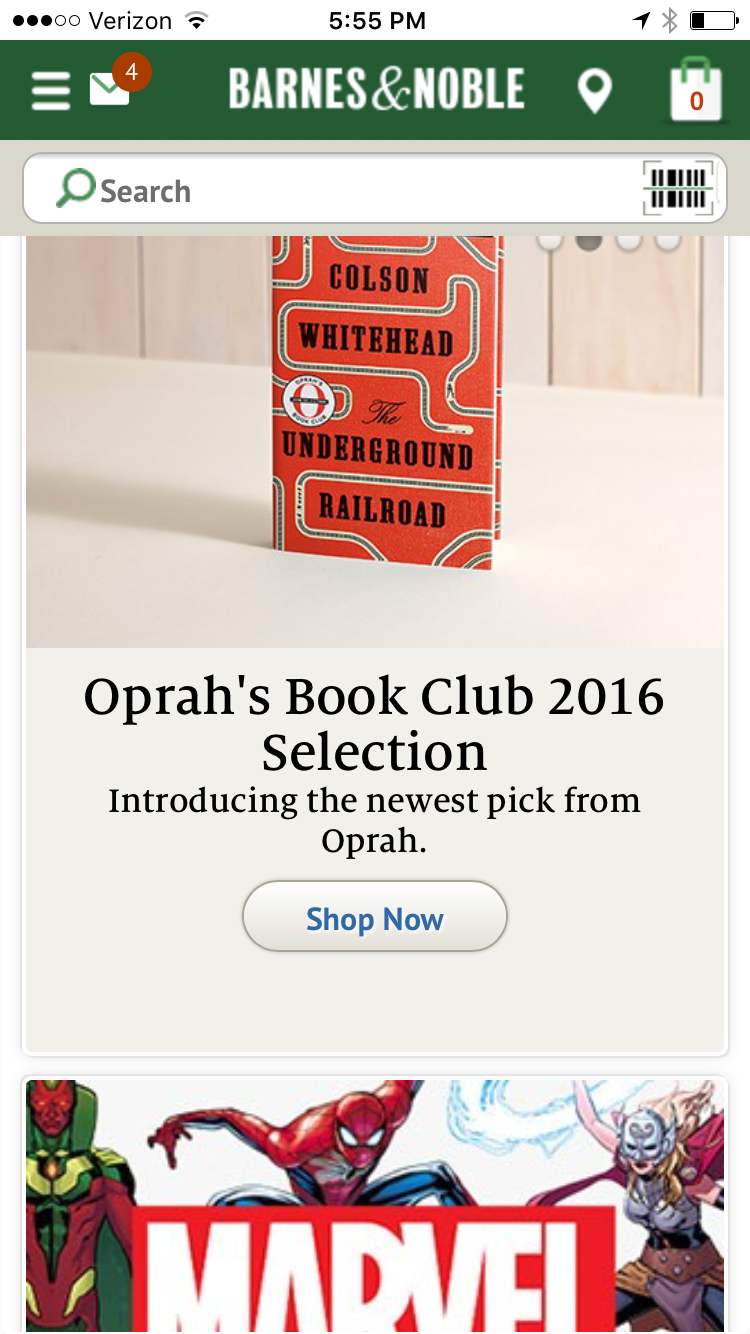 Barnes & Noble makes their message center visible with prominent placement in their app, and includes a badge indicating the number of new messages.