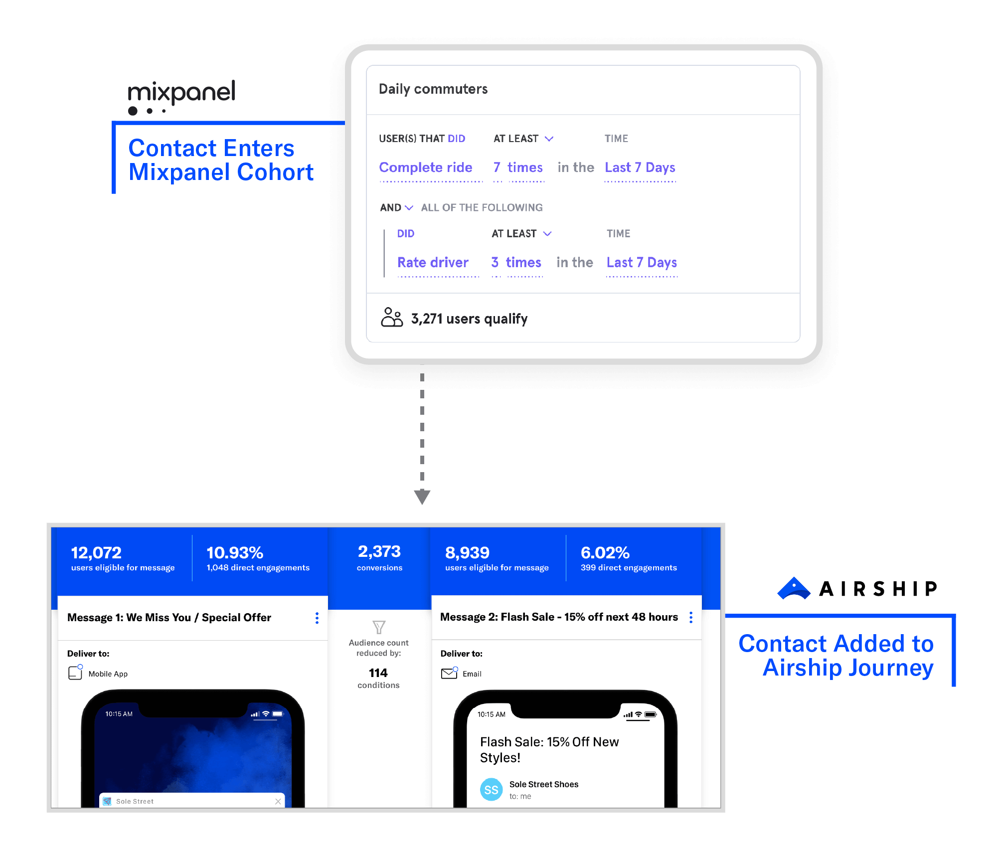 Tirez parti des données collectées au niveau utilisateur pour créer des cohortes dynamiques et envoyer des messages plus pertinents. Boostez l’engagement en enrôlant vos clients dans des parcours Airship personnalisés sur tout type de canal dès qu’ils rejoignent ou quittent des cohortes Mixpanel.