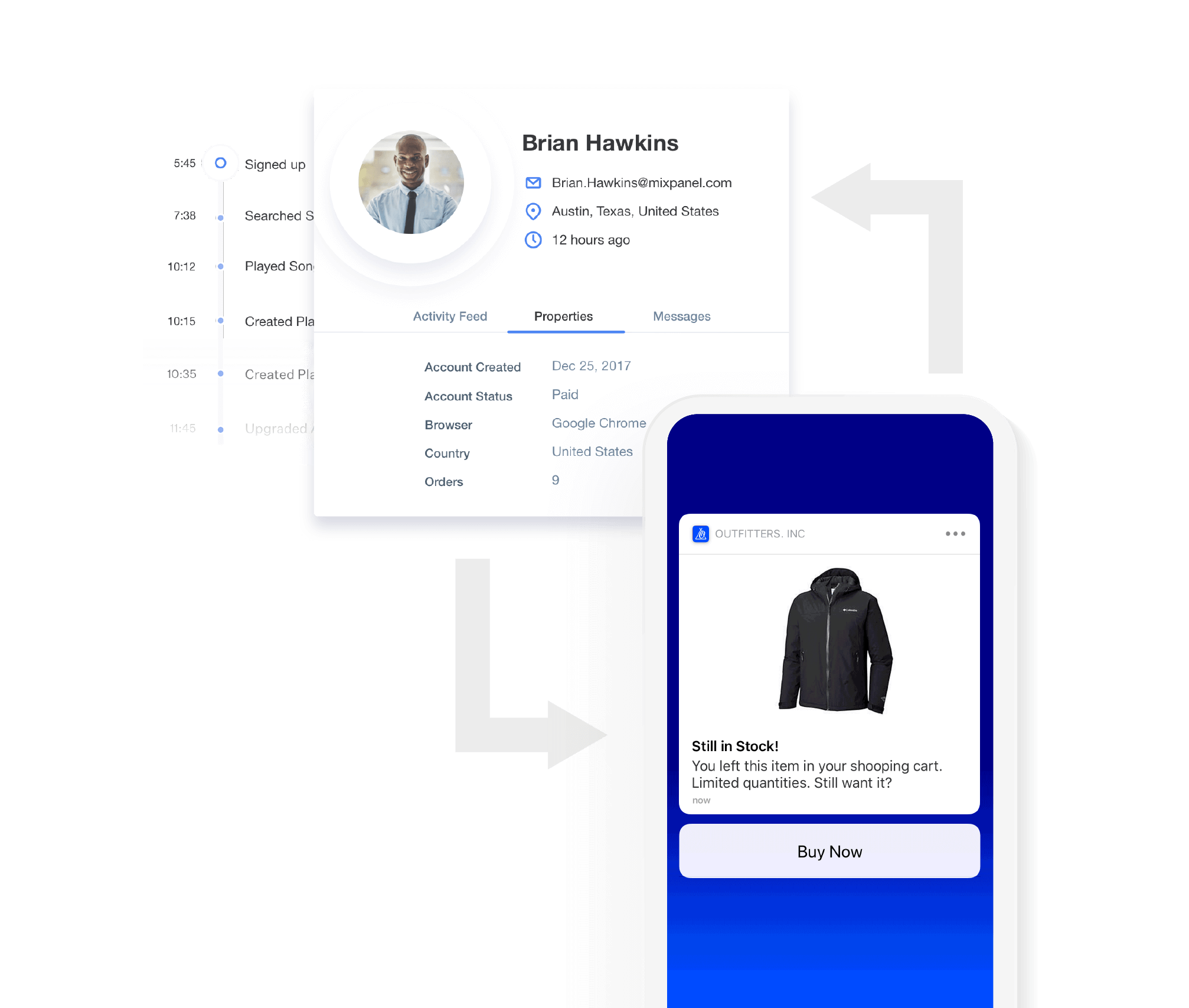 Créez des messages personnalisés et ultra ciblés sur Airship grâce aux données spécifiques utilisateur Mixpanel afin d’améliorer l’engagement client global. Réduisez le churn en identifiant les utilisateurs à risque dans Mixpanel afin de les reconquérir sur les canaux mobiles Airship.