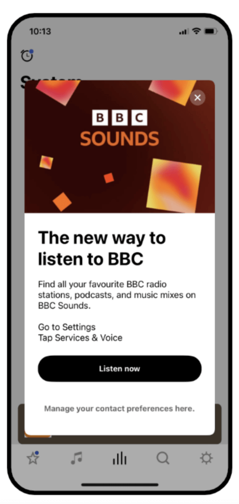 Les expériences destinées à informer les utilisateurs n’ont pas toujours besoin de plusieurs écrans. BBC News a utilisé une expérience in-app simple pour informer ses clients de la nouvelle fonctionnalité BBC Sounds.