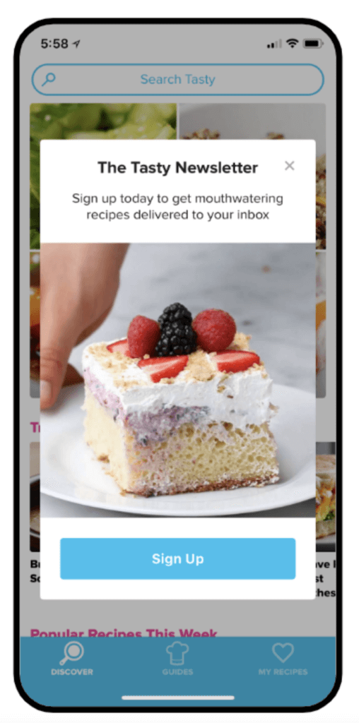 Tasty a choisi d’afficher un simple message dans son application pour favoriser les inscriptions à sa newsletter et stimuler la consommation de contenu.