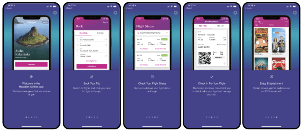Souvent utilisées sous forme de carrousel pour former les nouveaux utilisateurs aux fonctionnalités d’une application, les expériences in-app comme celle d’Hawaiian Airlines peuvent être cruciales pour faciliter l’adoption.