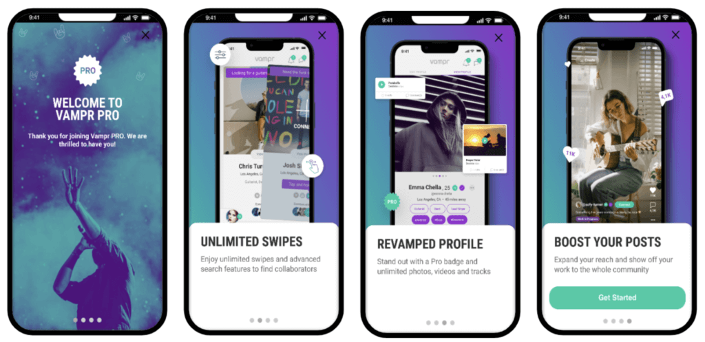 Vampr, une communauté de musiciens, explique à ses utilisateurs les avantages de leur abonnement Premium (payant) — Vampr Pro.