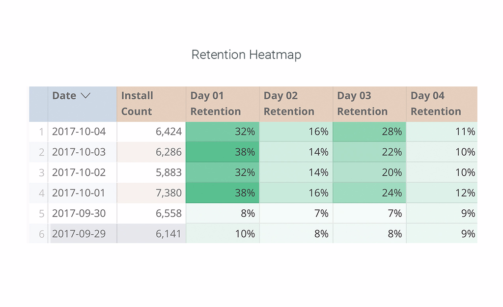 Discover the moments in your app experience that lead to above average retention. The Activation Heatmap Report allows you to see the impact a specific event (i.e. completing a profile, achieving a goal or using a specific feature) has on user retention. Choose any captured event to model which activities drive desired outcomes, then focus on engaging those segments with targeted messaging.