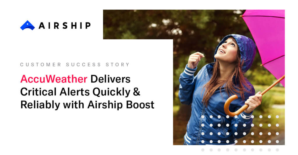 AccuWeather is the leading provider of vital weather forecasts to millions of global users every day. These alerts save lives, protect property, and ensure that its users are informed and prepared. But keeping millions of users informed requires massive amounts of segmentation and automation, which can slow down the delivery of time-critical details. Discover how AccuWeather uses Airship Boost to help their customers make critical decisions in record time (Read the story here).