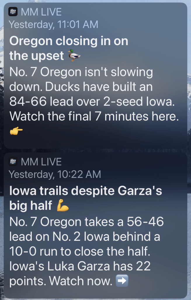 Years ago, most March Madness Live notifications provided game highlights and results as well as game time alerts tailored to users’ favorite teams — all aimed at driving users to the app to view live streams or highlights.