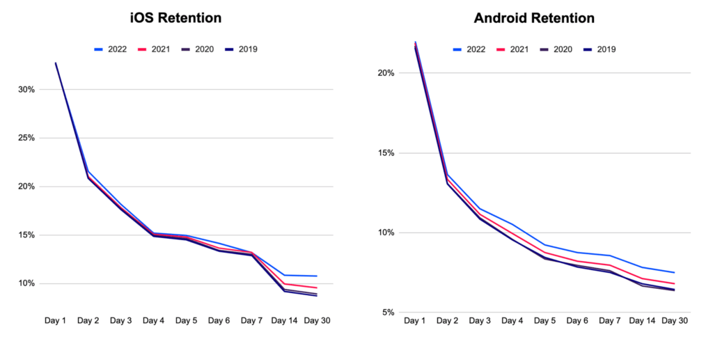 In 2022 year to date we’re seeing the Android retention rate drop by 38% between Days 1 and 2 and for iOS retention rates drop by 34% between Days 1 and 2. By Day 30 retention rates drop to an average of 9%.
