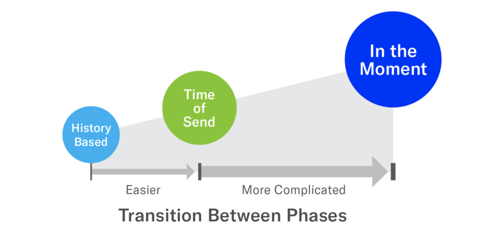 Similar to a brand’s mobile app experience, personalization moves along a maturity curve. We see brands progressing along three key phases: History Based, Time of Send and In the Moment.