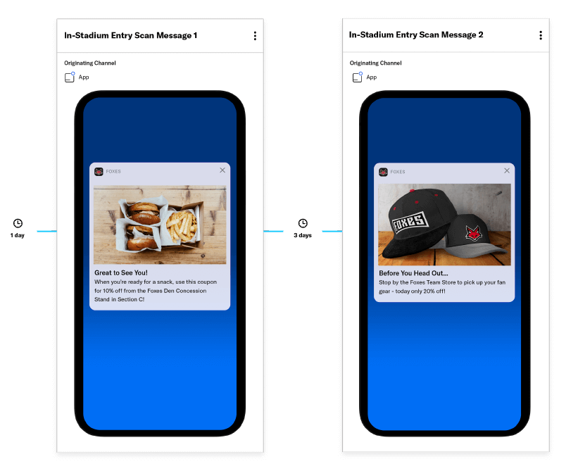 The first message lands the day after a ticket purchase, with an in-app notification alerting ticket-holders about the concessions in their specific seating area. Then, after they scan in at the event, they’ll receive an offer for discounted team merchandise – so they don’t miss out on wearing their team colors at the next game. It doesn’t get more contextual than that!