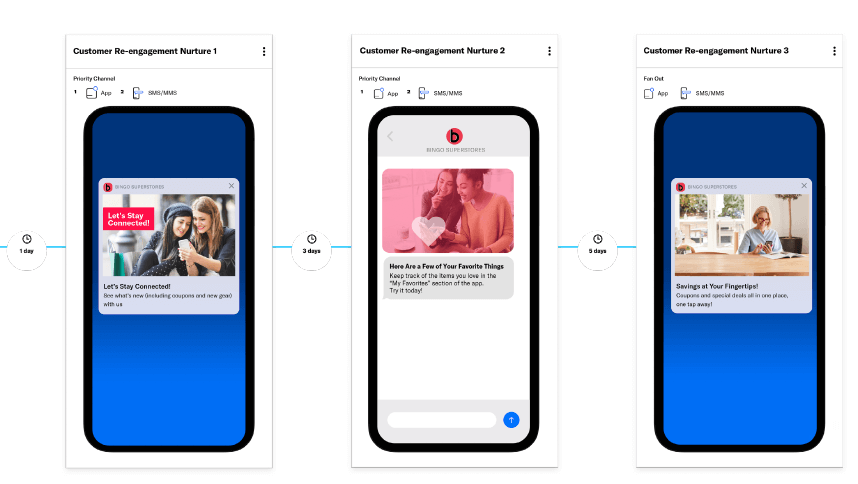 The journey starts on the customer’s priority channel with messages promoting features they may not be using. If they don’t re-engage after the first two messages, the follow-up fans out to all opted-in channels to ensure they don’t miss it. The result is a seamless series of cross-channel messages to keep customers engaged, before they become inactive.