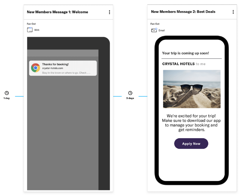 In this case, a new customer’s room reservation triggers a welcome message that also promotes mobile app downloads. A few days later, if they haven’t downloaded the app they’ll receive a second message reminding them about their trip and the benefits of using the app. It’s a short and sweet example of how a relatively simple customer journey can start moving new customers toward growth and retention.