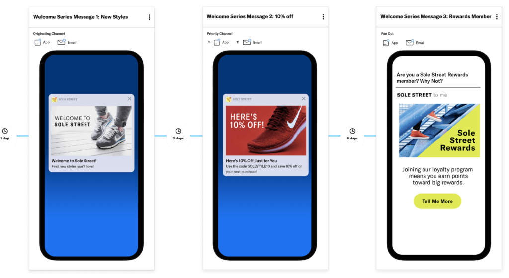 It starts on the customer’s original channel of engagement, either app or email, with a welcome message that drives them to your website. Two days later, a follow-up message uses Airship Journey’s prioritization feature to automatically select the channel, sending a special offer to their highest priority channel. Finally, for customers who haven’t joined the loyalty program, a third message lands five days later and fans out to all opted- in channels. This helps ensure customers see the message and don’t miss out on the benefits of loyalty.