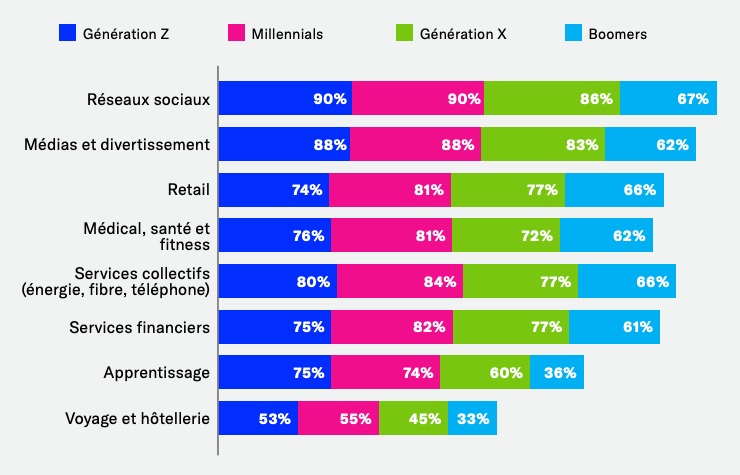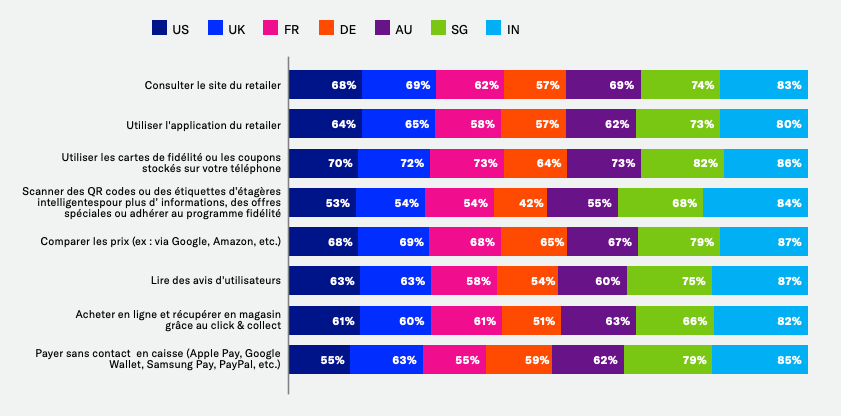 Alors que les frontières entre le monde physique et l’univers digital tendent à disparaître, plus de la moitié des répondants dans tous les pays ont déclaré qu’ils utiliseraient probablement leur smartphone en magasin dans le cadre de huit activités différentes – par exemple, ouvrir l’application d’un commerçant, utiliser une carte de fidélité ou des bons de réduction, ou scanner un code QR. À nouveau, les Millenials figurent en tête du classement, mais un pourcentage considérable de Boomers a également indiqué qu’ils seraient susceptibles d’utiliser leur smartphone lorsqu’ils parcourent les allées d’un magasin. Les marques d’aujourd’hui disposent donc d’une véritable occasion de se rapprocher des anciennes générations, en boutique ou par l’intermédiaire d’une application, en leur expliquant comment leur smartphone peut améliorer leur expérience d’achat en magasin.